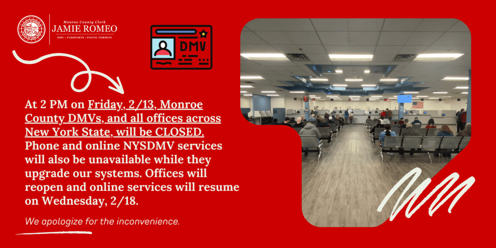 - Friday (all day) – Monroe County DMV offices closed for staff training. Other counties’ offices may vary; check your local DMV page.